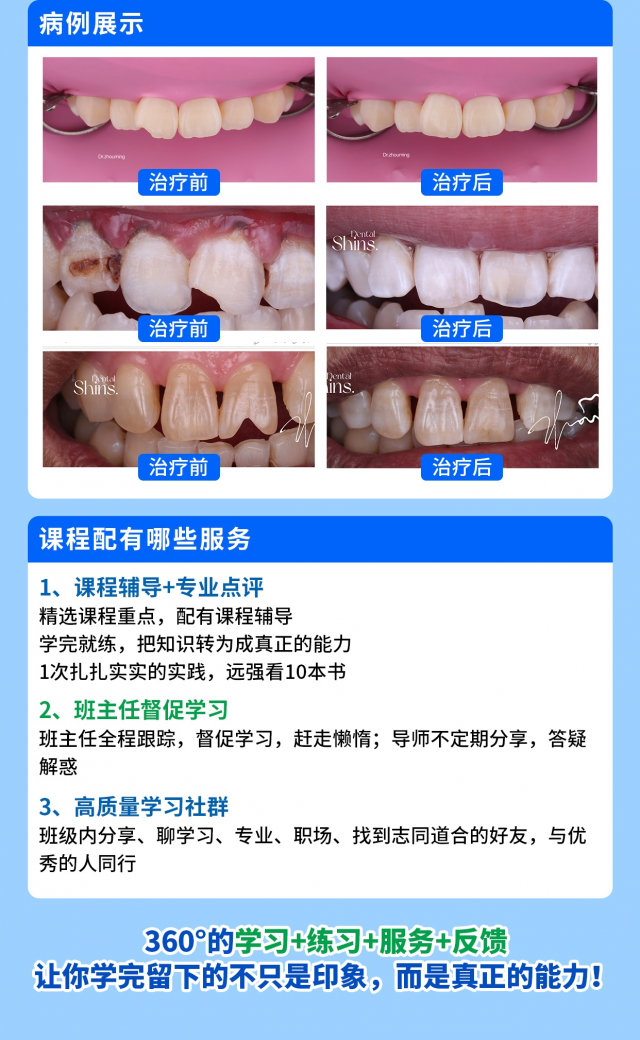 以上,就是这样一门包含了诸多干货内容+实操教学+实战作业+1V1服务的课程,售价 699 元,限时 399 元。仅仅一本口腔专业书籍的钱!