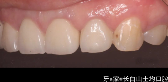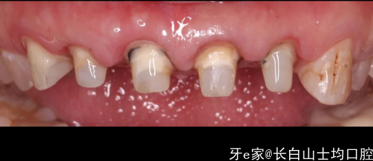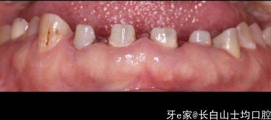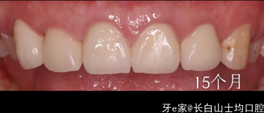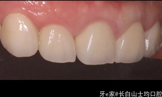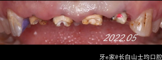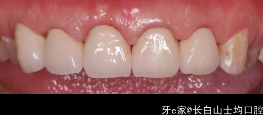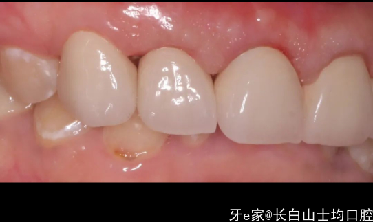 总结:有惊喜也有不足的地方,选择的单冠并没有像一部分医生认为的如果不做联冠就会出缝,我们能够看到,除了22近中的位置有一个间隙,其他位置总体没出现移位的情况,龈缘稍微有些红,这可能是当时肩台和牙冠的边缘有不密合的情况导致的,当时备牙时,肩台是原有的肩台,只做了一点修整和抛光,手术六周后,患者非常着急想把牙做好,于是没有做临时冠做龈缘的诱导,直接做了最终修复,这些小偏差都引导了我们最后的结局。