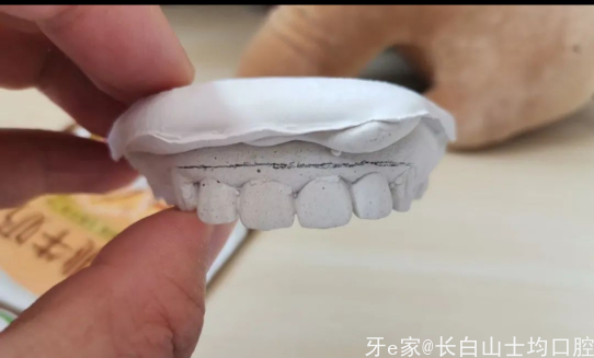 1.患者四个残根,当时看片子(片子遗失)四个根的根管做的都不理想,需要重新做,然后打桩修复,方案定向简单,说干就干。2.针对第一个问题,和修复方案的确定,我们发现患者是一个深覆合,这里面就给最终修复的美学带来了难题,为啥说难题,之前的照片找不到了,但是有个石膏模型的照片。