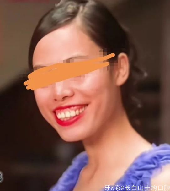 通过这个照片和这条铅笔画的线我们能看到,2-2和3的龈缘位置非常不美观,两个牙往下长了,为了让牙齿长宽比例舒服一些,牙齿就做长了,但是患者的面照就很像她