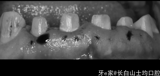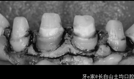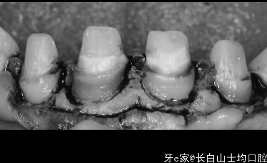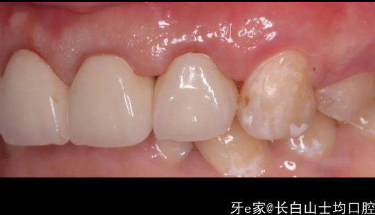 3.我们能看到龈缘发黑,还有点肿,幸运的是患者的牙龈很厚,好像没太大炎症,但是探诊发现,之前备牙的肩台在龈下非常深的位置,这个就是医源性的问题了,不多说…