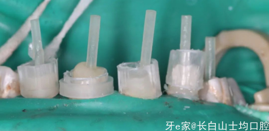 对前面四颗残根进行了纤维桩的重建