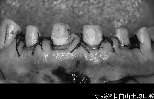 翻瓣后,看到骨缘距离肩台的距离很近,为1-1.5㎜,所以用高速球钻修整骨缘,使骨缘距离肩台距离达到3㎜,同时用刮治器去掉残余的牙周膜组织,并用马尼TR13ef对根面进行抛光,最后做了缝合,缝合在龈乳头位置缝合即可,看到唇系带的位置过低,也顺便做了一个修整;在伤口处有牙周敷料的可以放上,没有不放也可以。